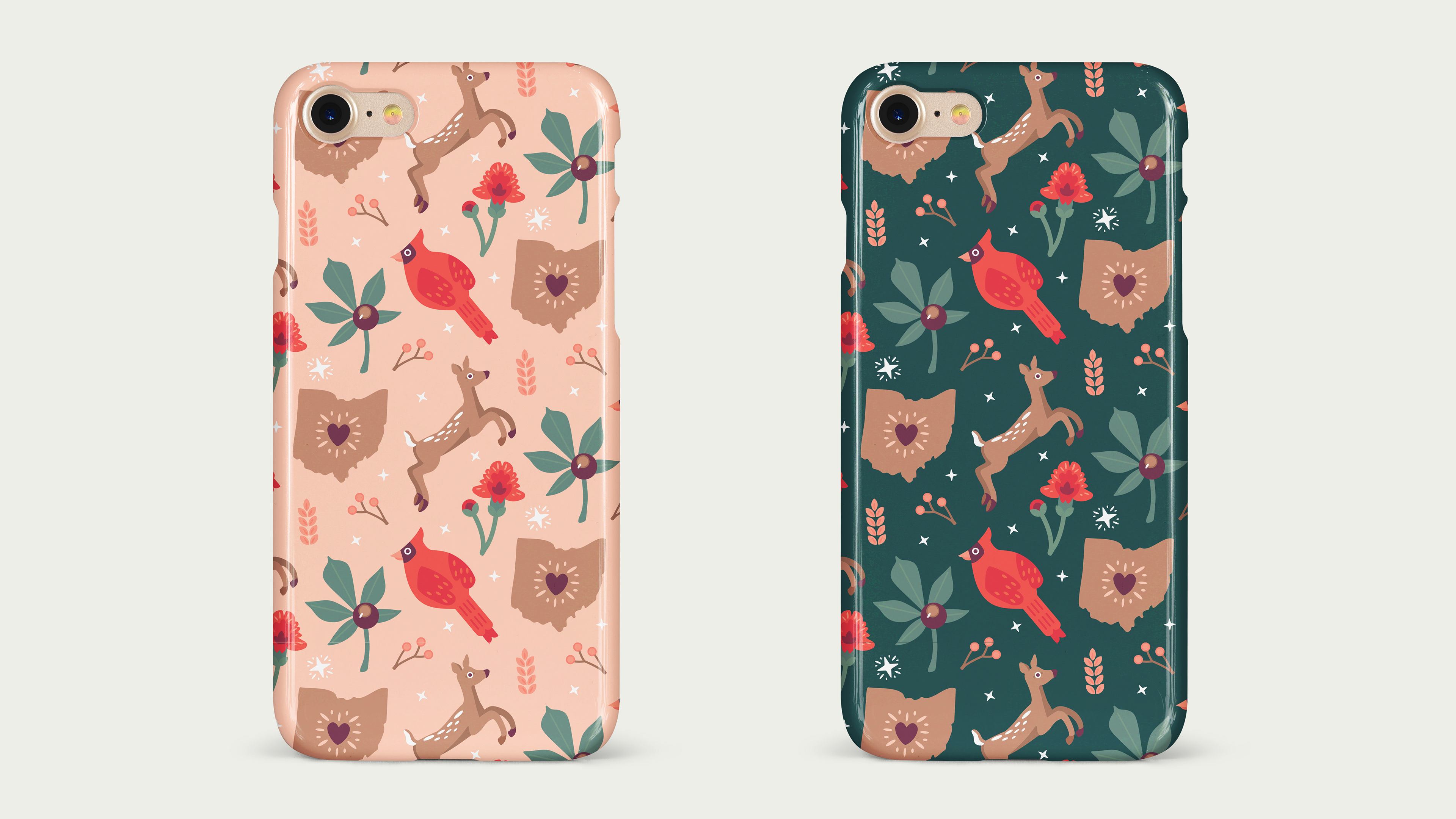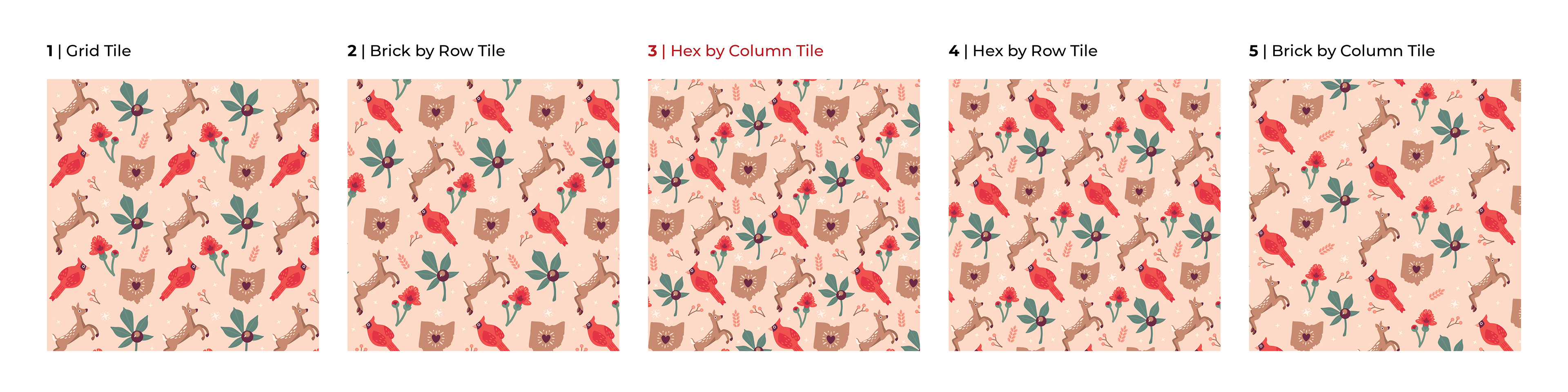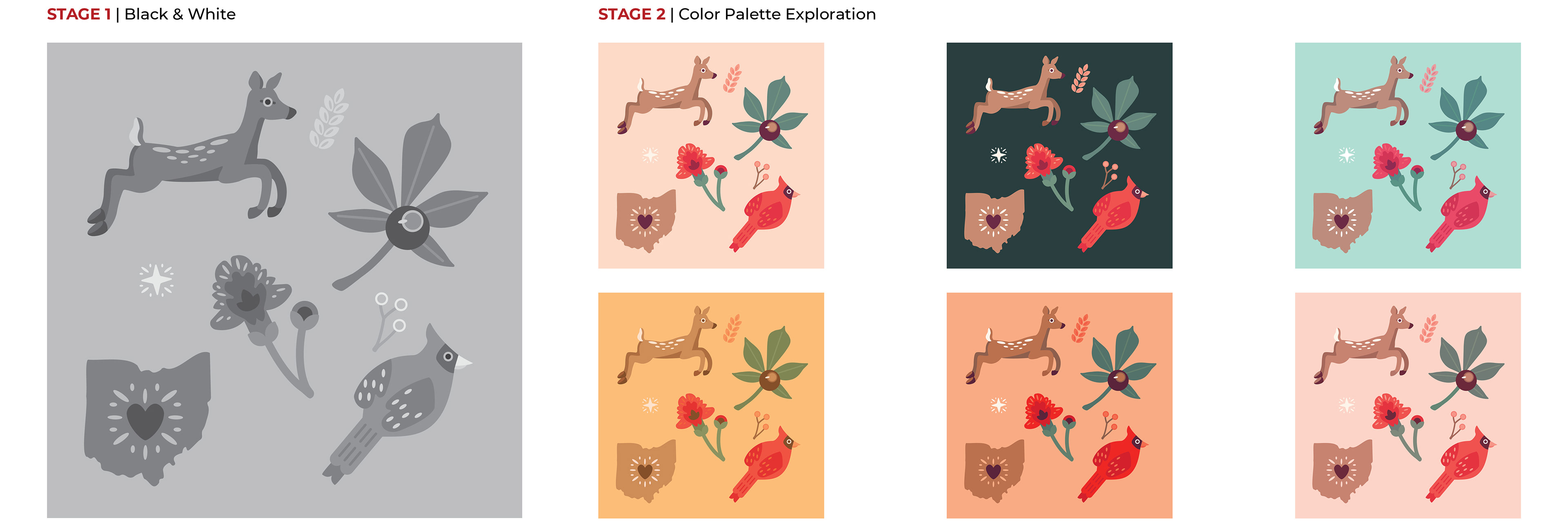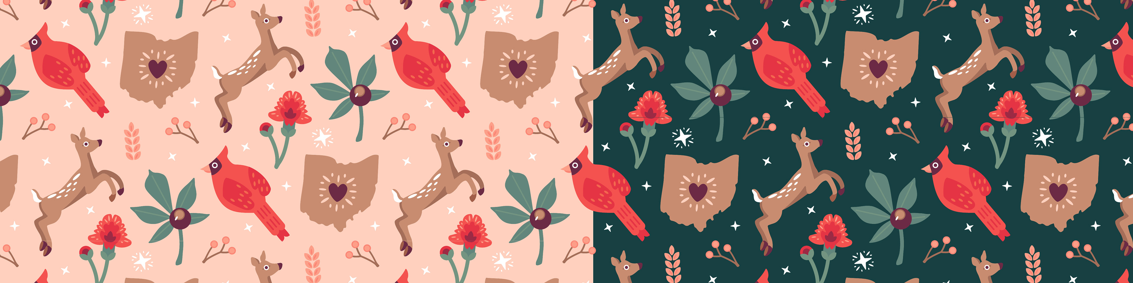 IV. DESIGN & BUILD, ITERATIONS, & FINAL DESIGN: I chose the white-tailed deer, carnation, cardinal, state, and buckeye as the main pattern illustrations out of my sketches. I decided to use stars, wheat stalks, and holly branches as filler illustrations.