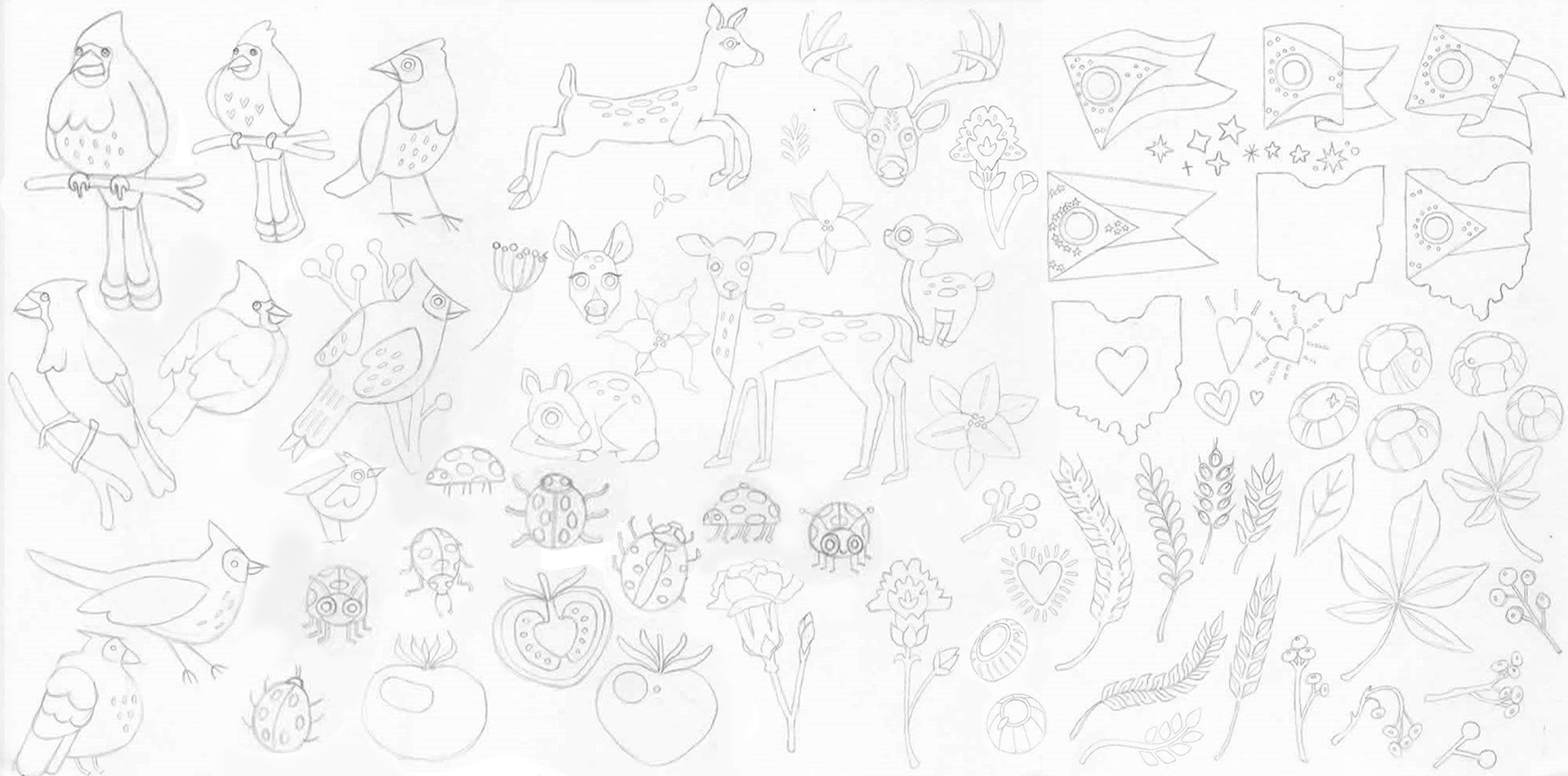 III. SKETCHES: Next, I started to develop my illustrations by sketching out the various Ohio symbols. I explored different shapes and levels of realism.