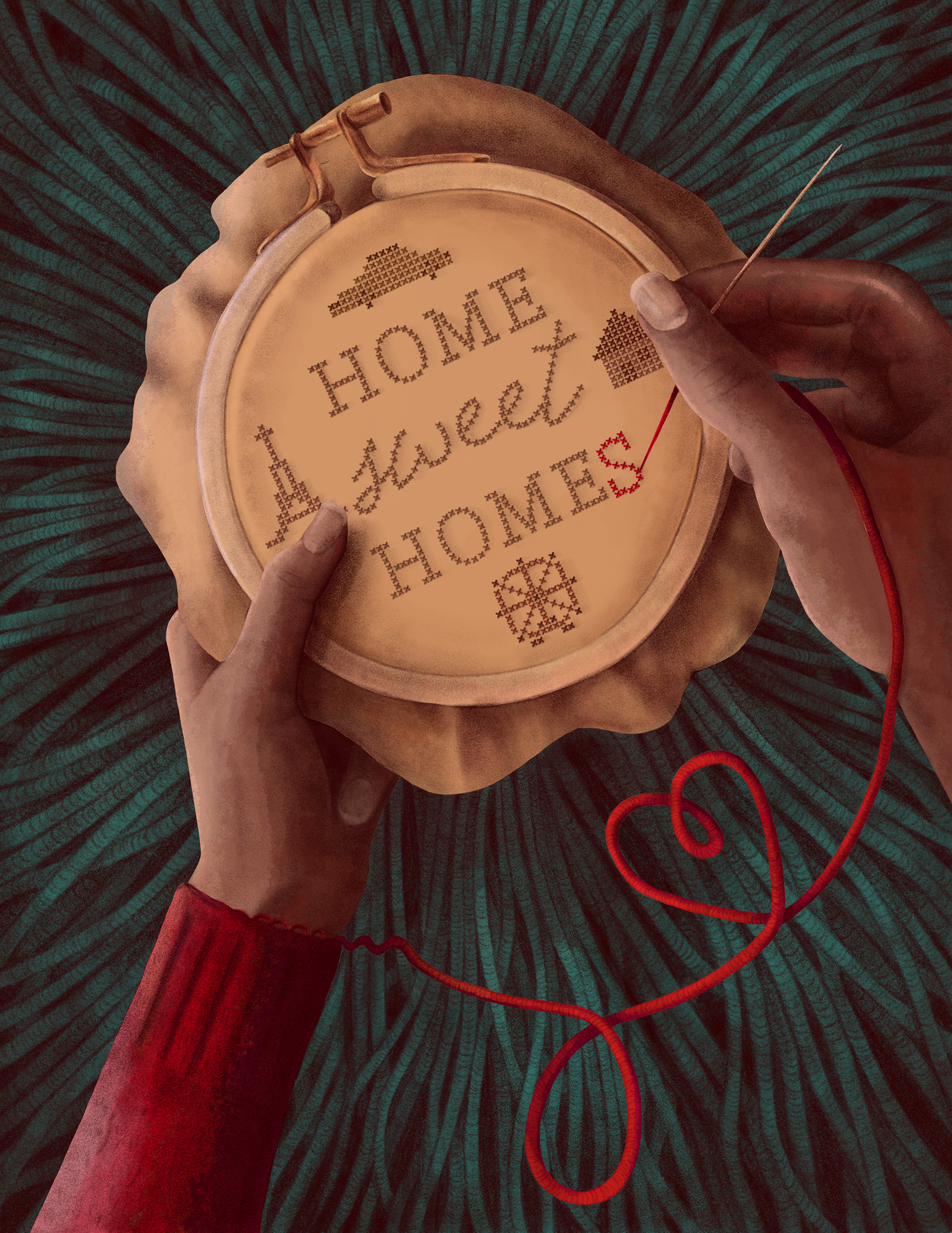 My illustration captures these themes by using a play on the common saying "home sweet home," which I usually imagine being embroidered and framed on a wall. Instead of the usual phrase, my illustration features "home sweet homes" being sewn by an individual, while the thread comes from their sleeve. This image draws connections between the two main ideas of the article: the plurality of homes and the home as an extension of ourselves.