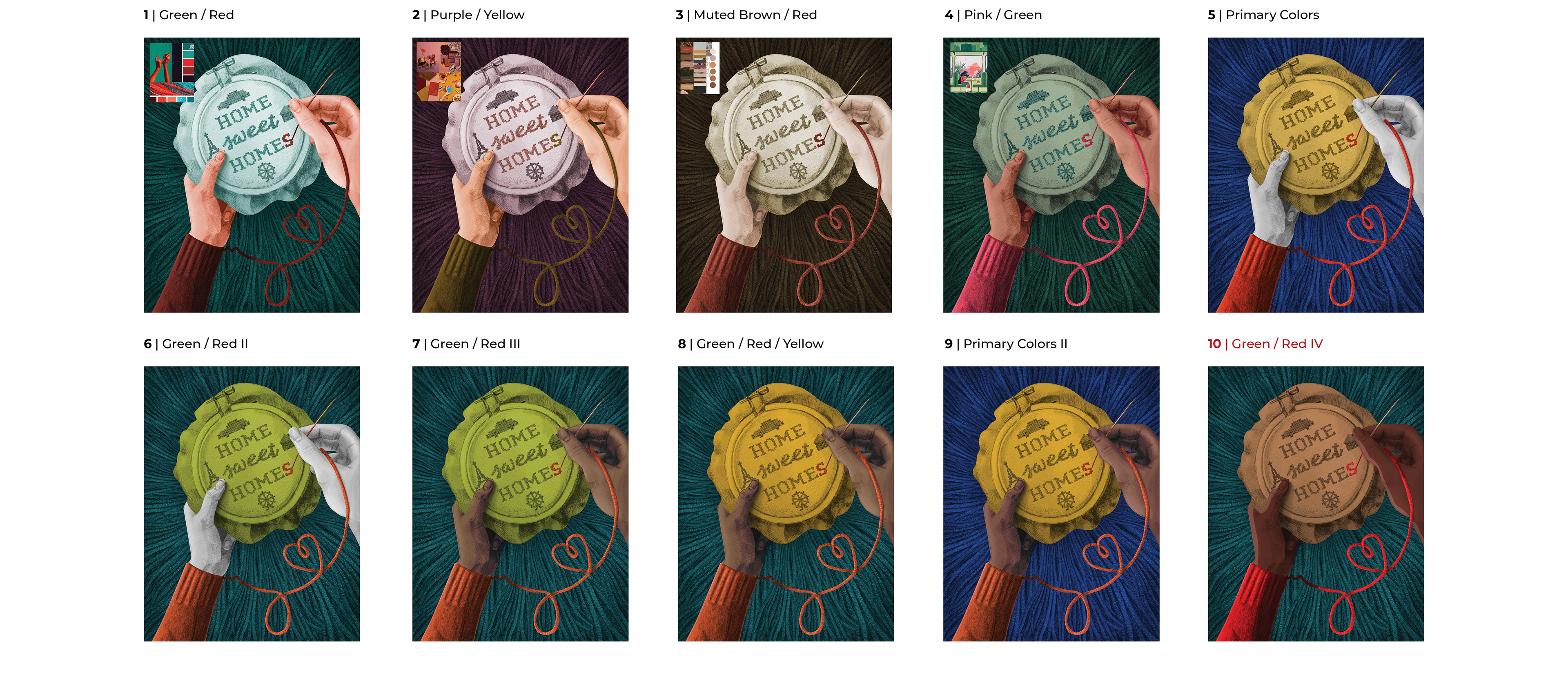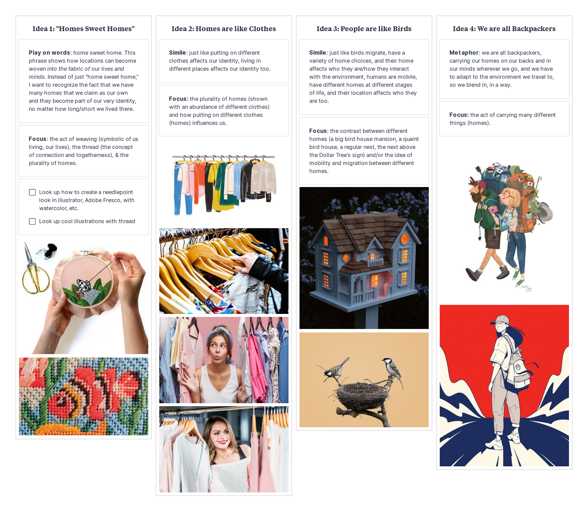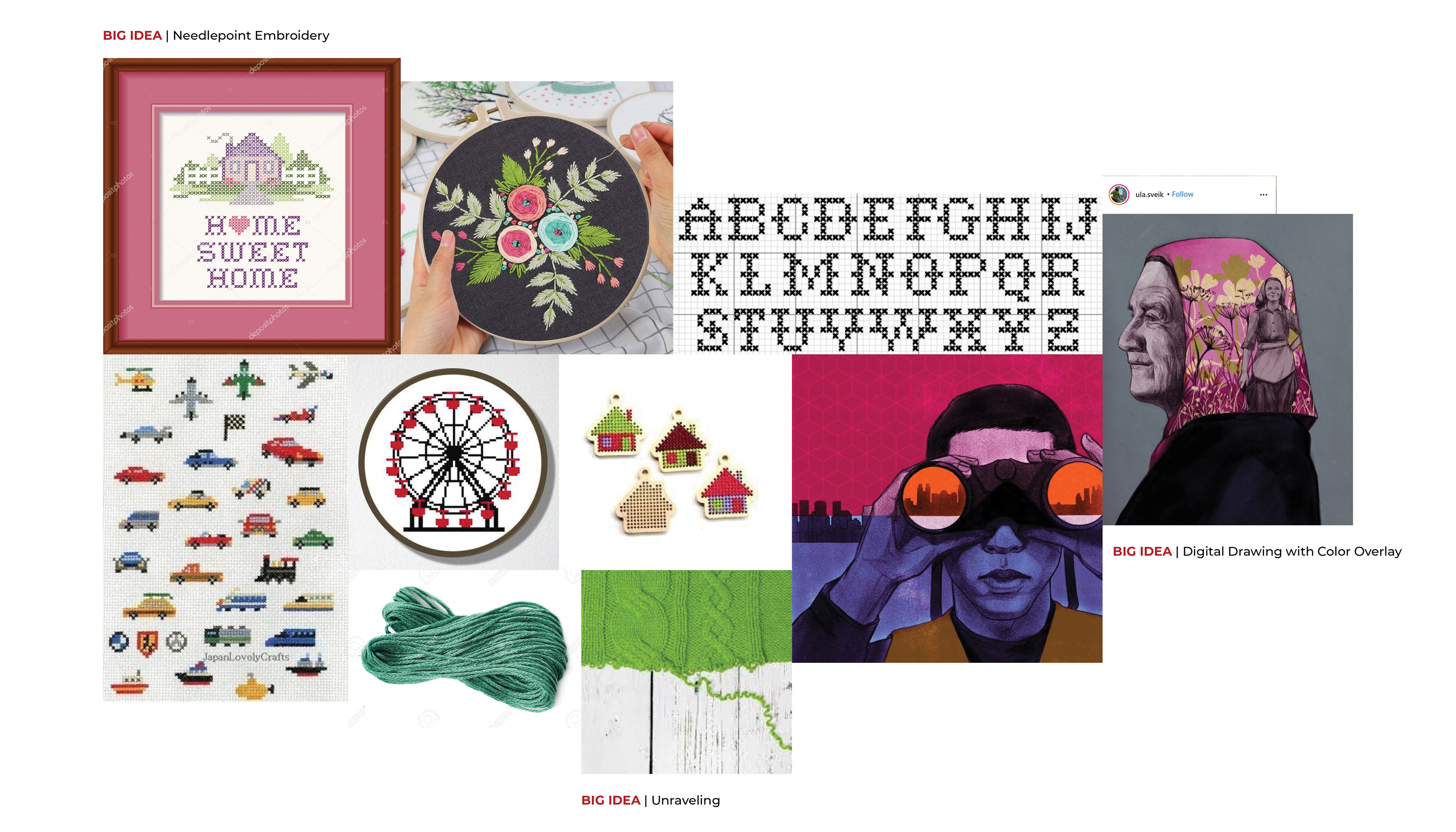 II. VISUAL RESEARCH: Next, I collected imagery and existing editorial illustrations to influence my sketches. Shown are the images I gathered for my first concept about a needlepoint "home sweet homes" embroidery hoop.