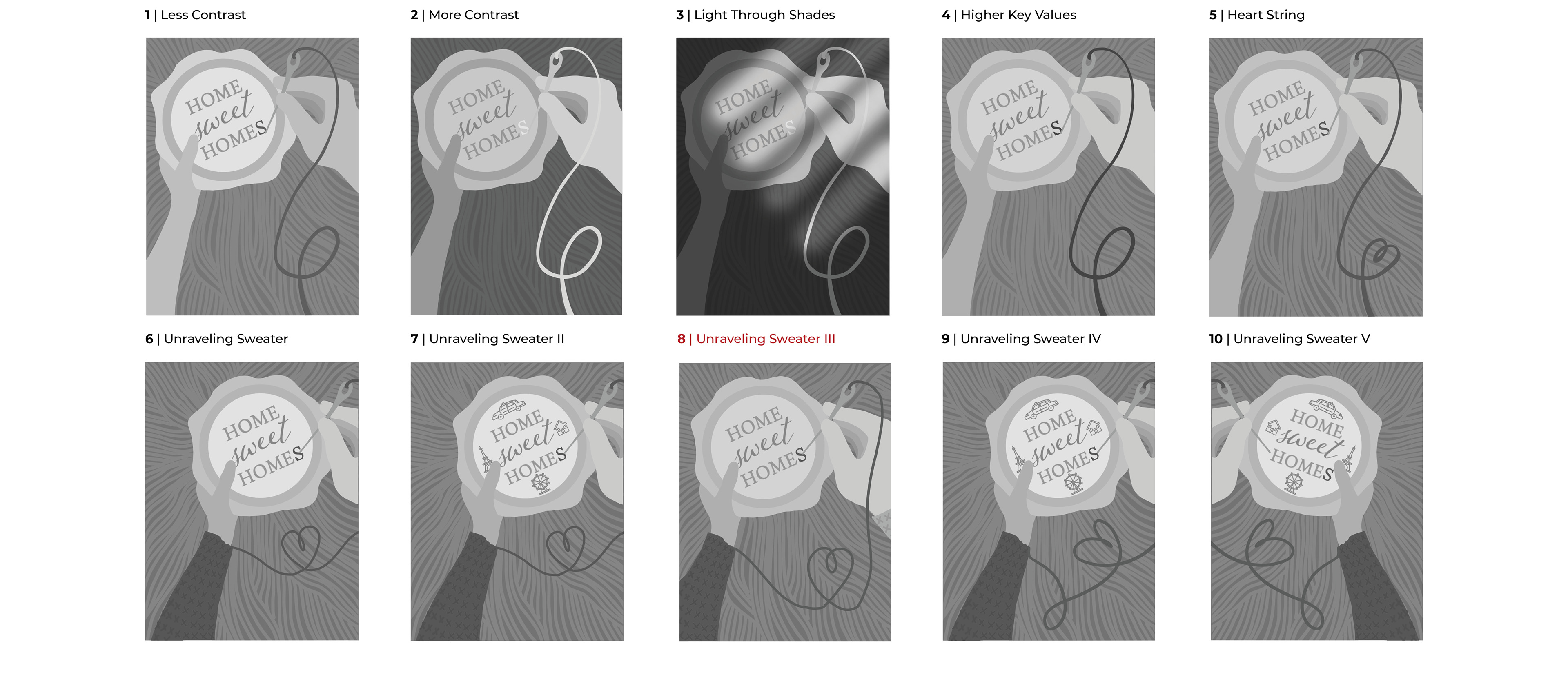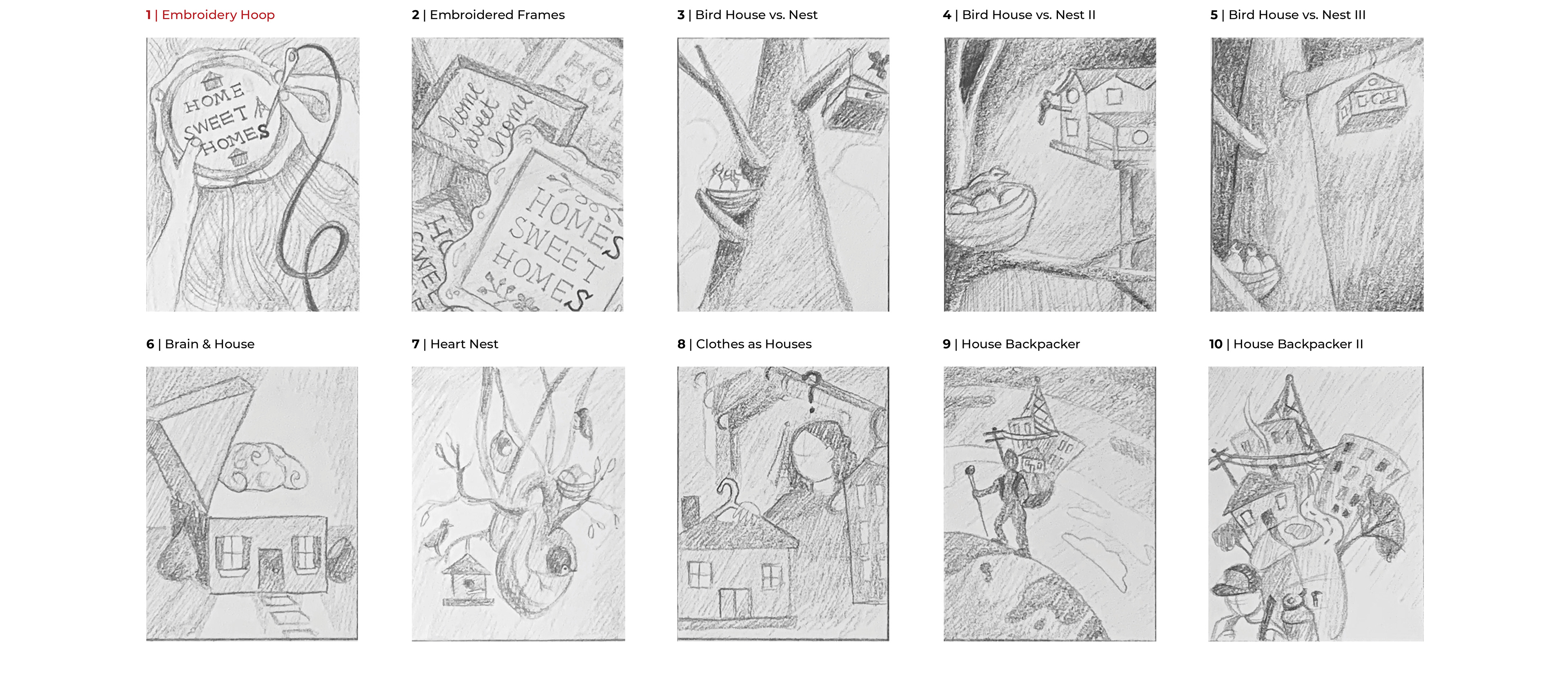III. ITERATIONS: Below are the ten thumbnail sketches I completed, each referring to a different concept I developed during my brainstorming.