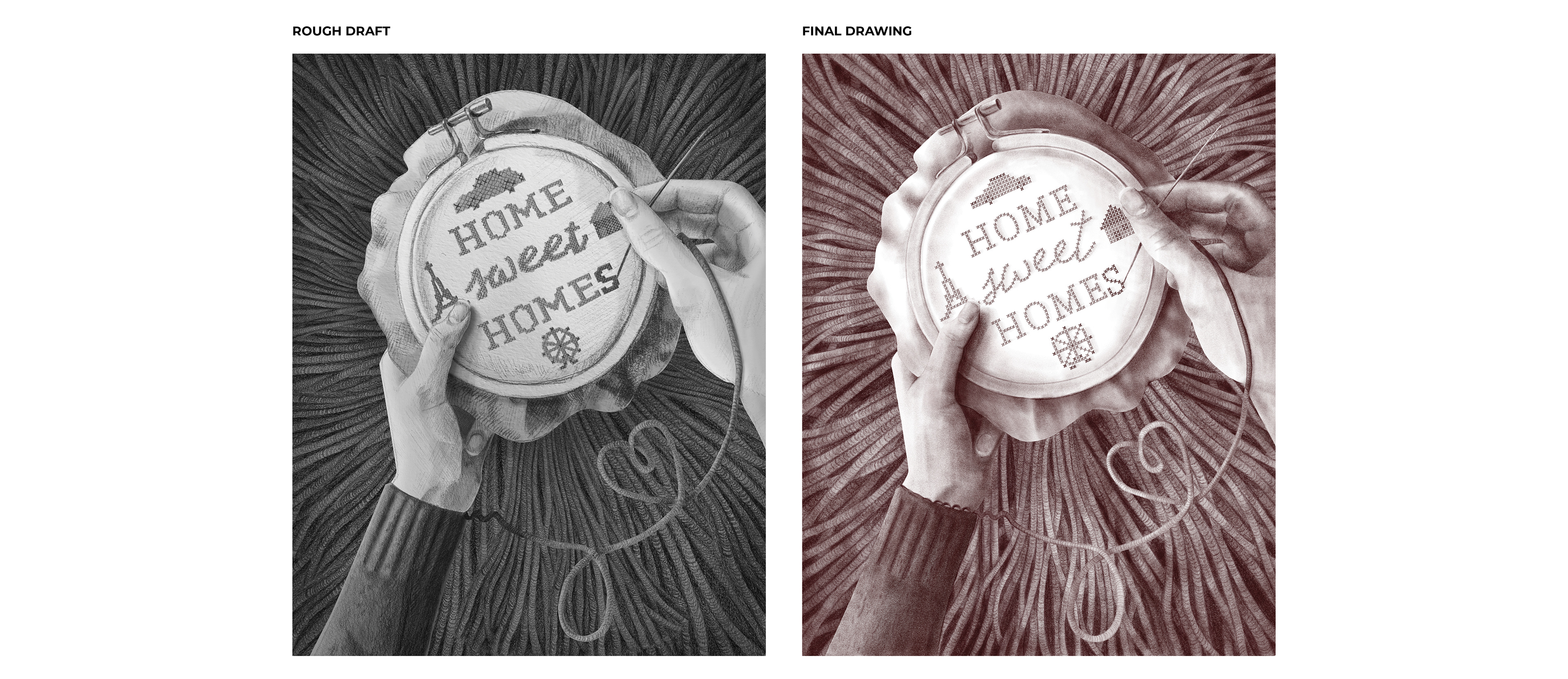 Left: A clearer view of the final illustration. The red sweater leads the eye to the red "s" at the end of "homes," drawing attention to the message of the illustration.