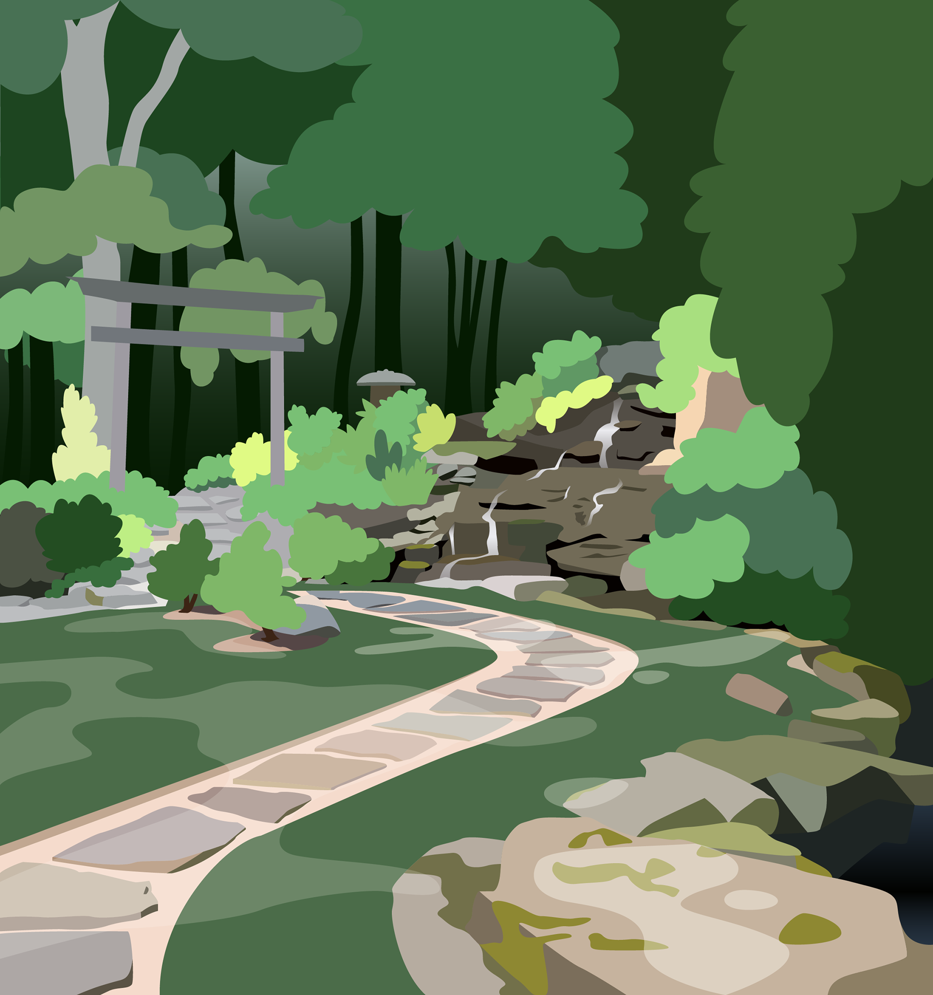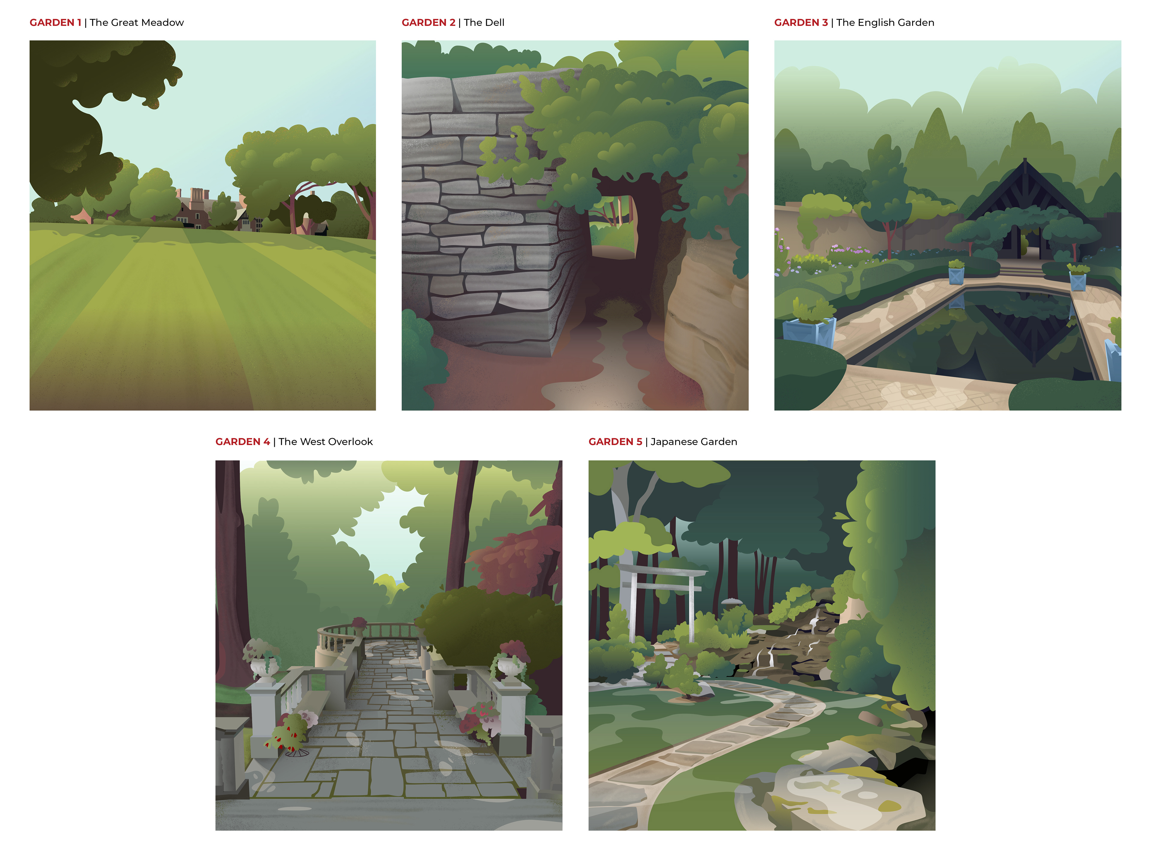 III. ITERATIONS: Next, I used the photographs I took to develop my illustrations in Illustrator. The illustrative style I used has a heavy focus on shape, value, and color. The final images are accurate to the gardens and can be used to inform visitors.