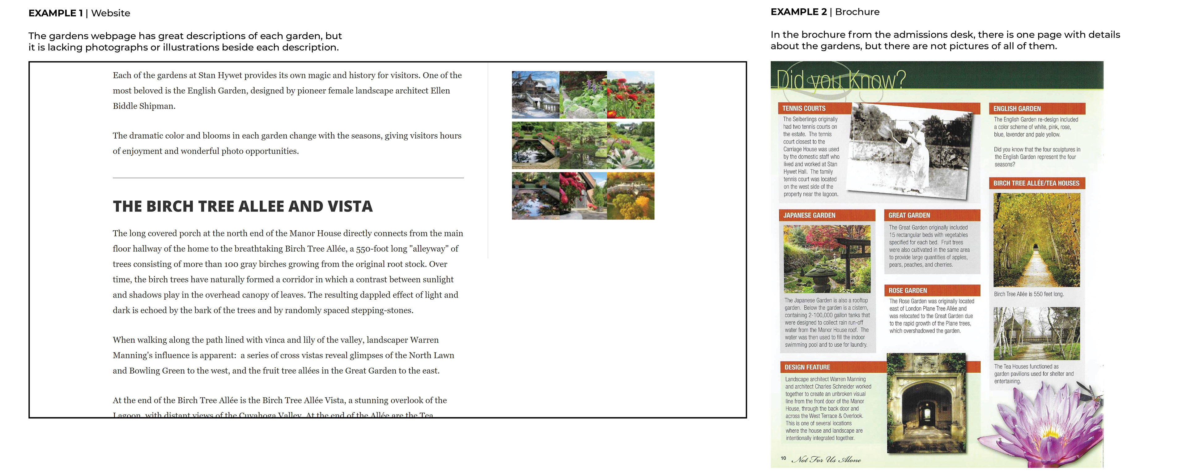I chose Stan Hywet because it was the most personal to me, and I was able to identify a problem that I could solve. After visiting the museum and the website, I saw that there were not many images of the gardens on brochures or the webpage that visitors could use to discern which ones to visit. The solution I came up with was to design a booklet with illustrations, a map, and descriptions of the gardens.