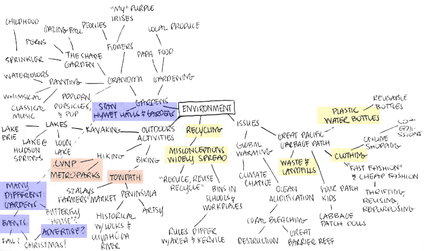 I. IDEATION: The project topic was up to my discretion, so I began by "brain dumping" my interests and passions. Most of the ideas in the list related to the topic of nature/environment. I used this as the starting point for a mind map (shown below).
